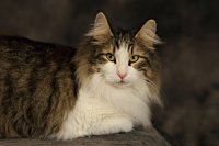 Bateia ist die unangefochtene Norwegerchefin des Hauses. Optisch ist sie eher eine Vertreterin des alten NFO-Typs, mit einer beachtlichen Ausstellungskarriere. Sie hat einen kompakten Körperbau mit stämmigen Füßen, ein absolut gerades Profil, große Ohren, schräg gesetzte Augen und ein kräftiges Kinn.