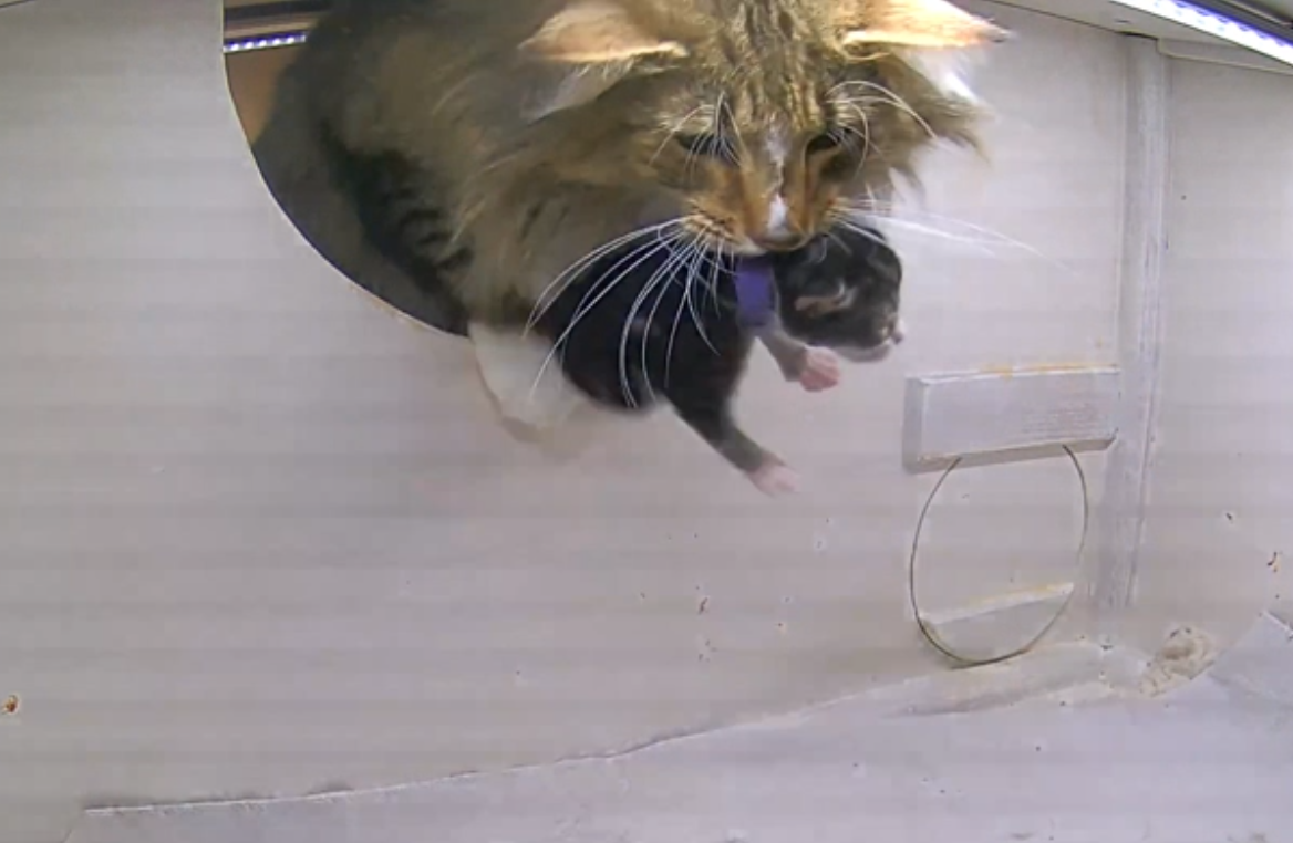 Sie hat zuerst die Situation in der großen Wurfkiste abgecheckt und danach Kitten um Kitten umgezogen.