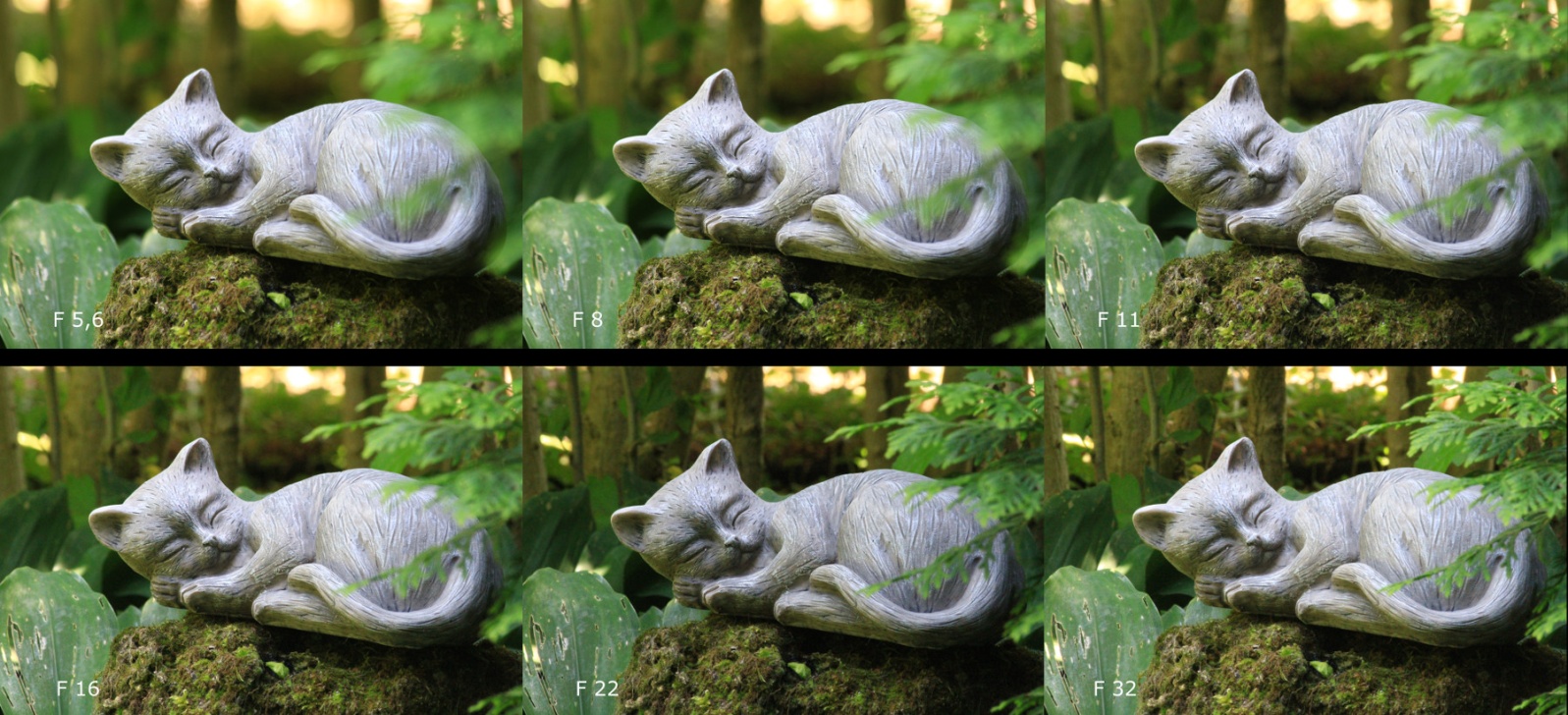 Die Beispielbildfolge zeigt eine Steinkatze in 120 cm Entfernung. Im mittleren Bild wurde korrekt auf die Katze fokussiert, Vorder- und Hintergrund sind unscharf. Im linken Bild wurde auf 75 cm fokussiert. Die Katze und der Hintergrund sind unscharf, der Zweig im Vordergrund ist aber scharf. Im rechten Bild erscheint bei einem Fokus von 250 cm der Hintergrund scharf, die Katze und der Vordergrund sind unscharf.