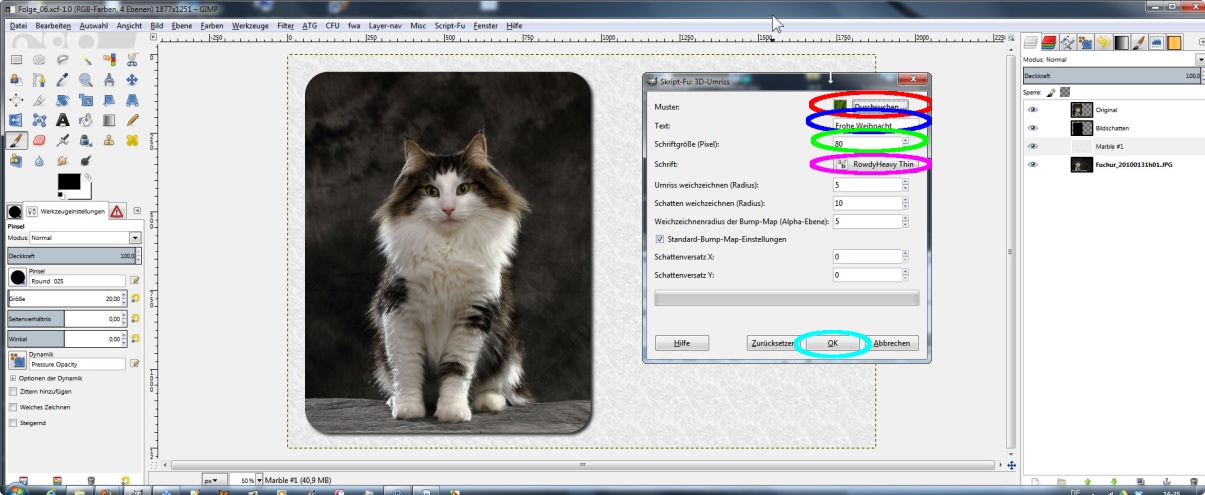 Im nächsten Schritt wollen wir unsere Karte in eine Weihnachtskarte verwandeln. Ausgangsbasis ist unser Bild mit gerundeter Maske inklusive Schatten und dem Hintergrundmuster „Marble #1". Für den Schriftzug „Frohe Weihnacht" wollen wir diesmal ein etwas aufwendigeres Verfahren verwenden, indem wir die Schrift in einem neuen Bildfenster als Logo erstellen (Menü: „Datei" – „Erstellen" – „Logos" – 3D-Umriss").